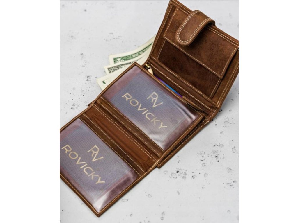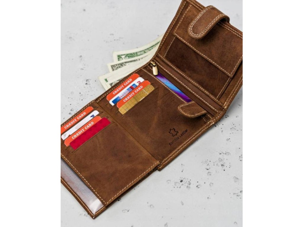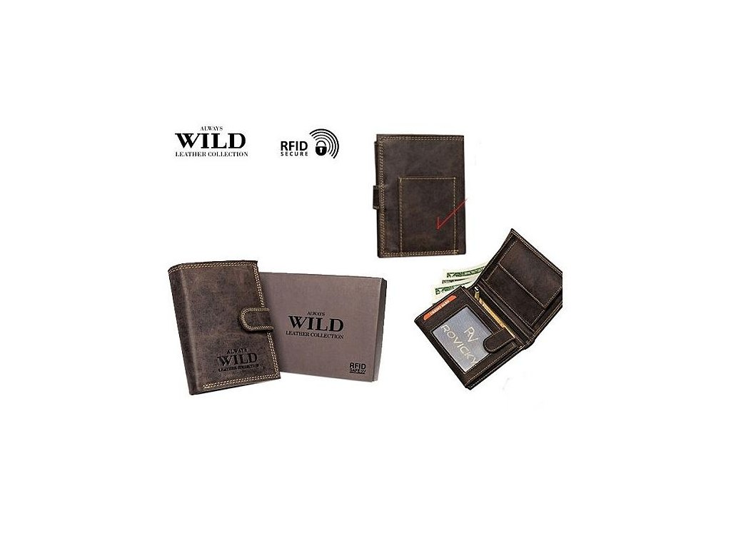 Pánska kožená peňaženka značky Always Wild N104 Peňaženka obsahuje 12 priečinkov na karty, ktoré sú uzatvorené kovovým cvokom. Peňaženka má dva priečinky na papierové peniaze. Mincovník sa zapína na kovový cvok a má jeden priečinok. V strede peňaženky sa nachádza priečinok zapínajúci sa na zips. Peňaženka má zabezpečenie proti ukradnutiu dát z kreditných kariet. Peňaženka je balená v krabičke.